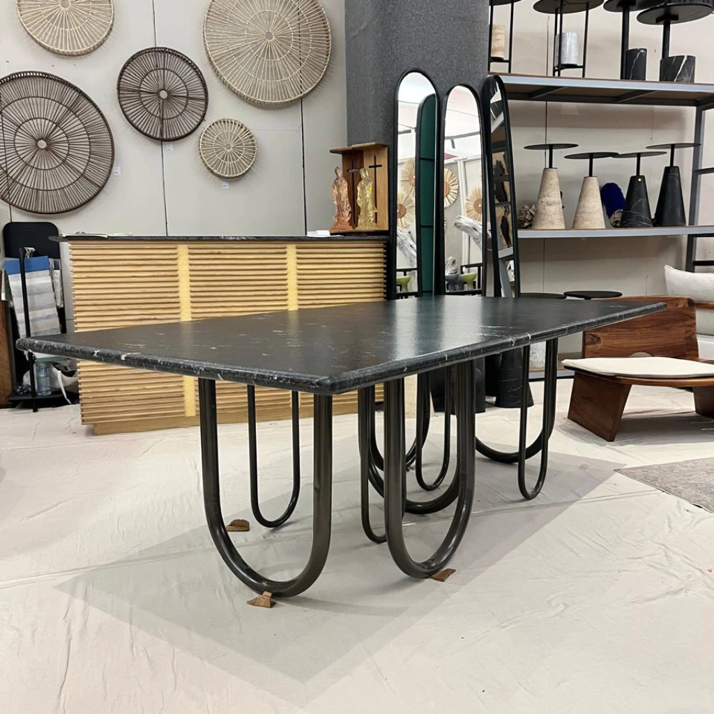 La base de herrería tubular no solo garantiza una estructura resistente y duradera, sino que también ofrece un diseño contemporáneo que complementa perfectamente la belleza natural del mármol. Ideal para quienes buscan un comedor que sea tanto una obra de arte como un espacio funcional para compartir momentos especiales.